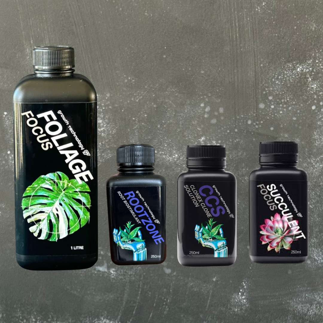 Choose Foliage Focus (Indoor, tropical plants), Succulent Focus (Cacti or Succulents), or Clonex Clone Solution (Propagations, seedlings, and freshly potted propagations) and add 3-5mL per litre of water. Pair with Rootzone by adding 1mL of Rootzone to any of these base formulas. Water your plants with your nutrients regularly for maximum benefit.
